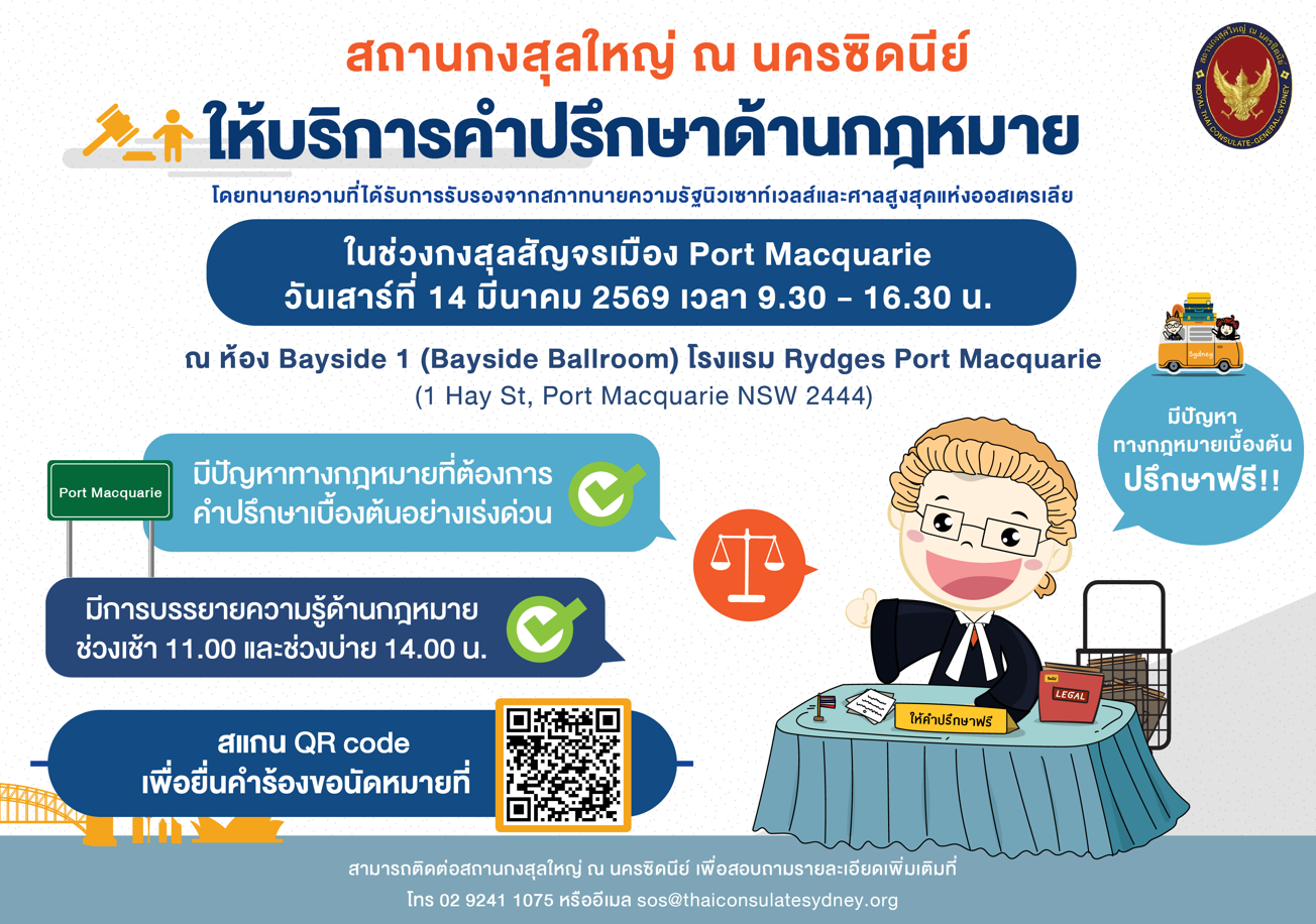 พิเศษ! “บริการให้คำปรึกษาด้านกฎหมายฟรี” ในบริการกงสุลสัญจรเมือง Port Macquarie