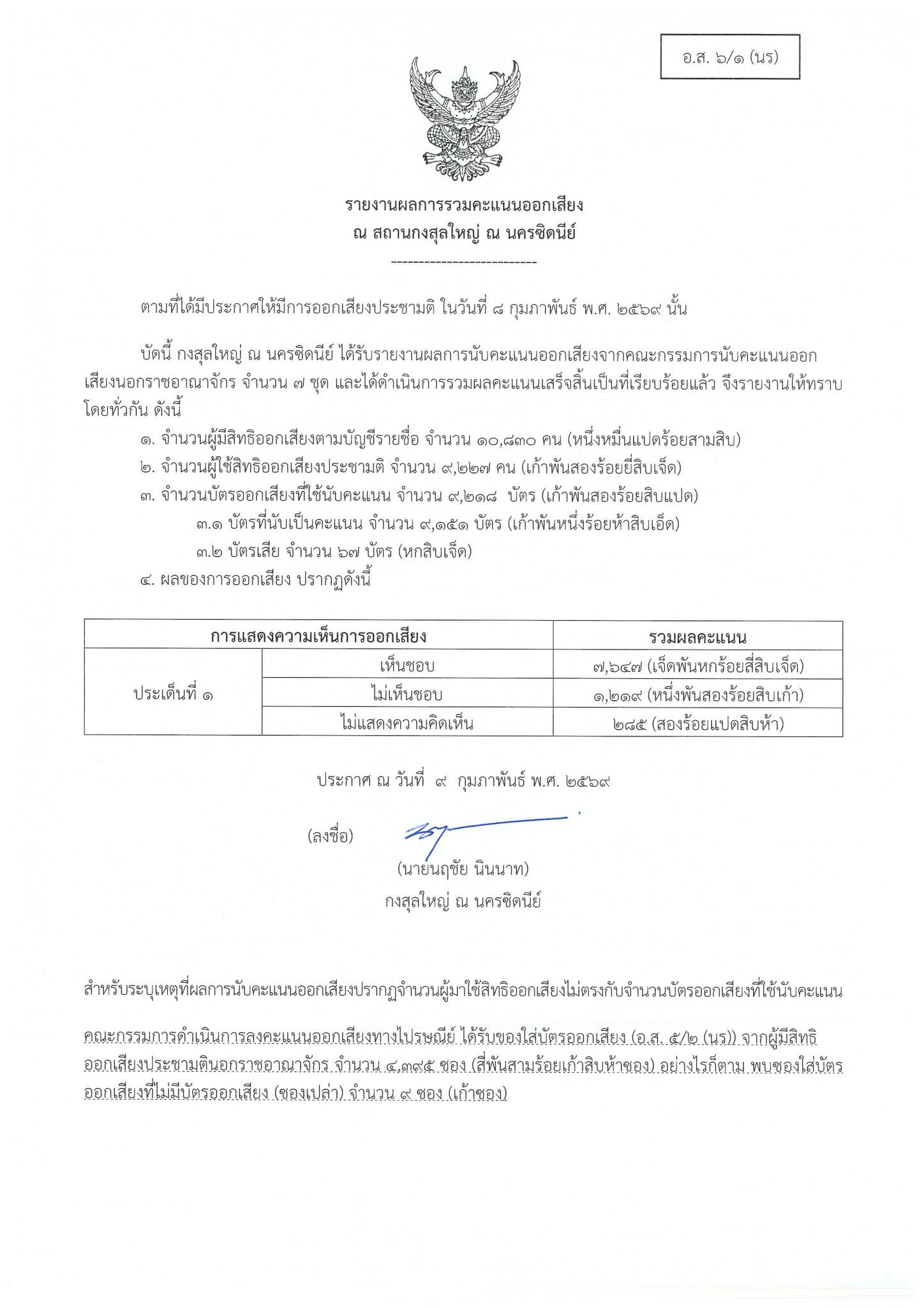 ประกาศผลการนับคะแนนออกเสียงประชามตินอกราชอาณาจักร