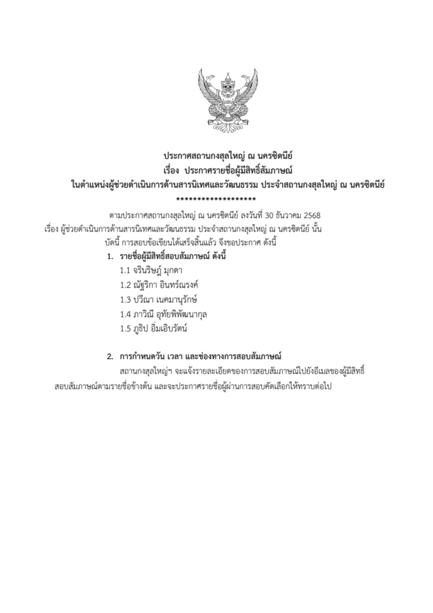 ประกาศรายชื่อผู้มีสิทธิ์สอบสัมภาษณ์ในตำแหน่งผู้ช่วยดำเนินการด้านสารนิเทศและวัฒนธรรม ประจำสถานกงสุลใหญ่ ณ นครซิดนีย์