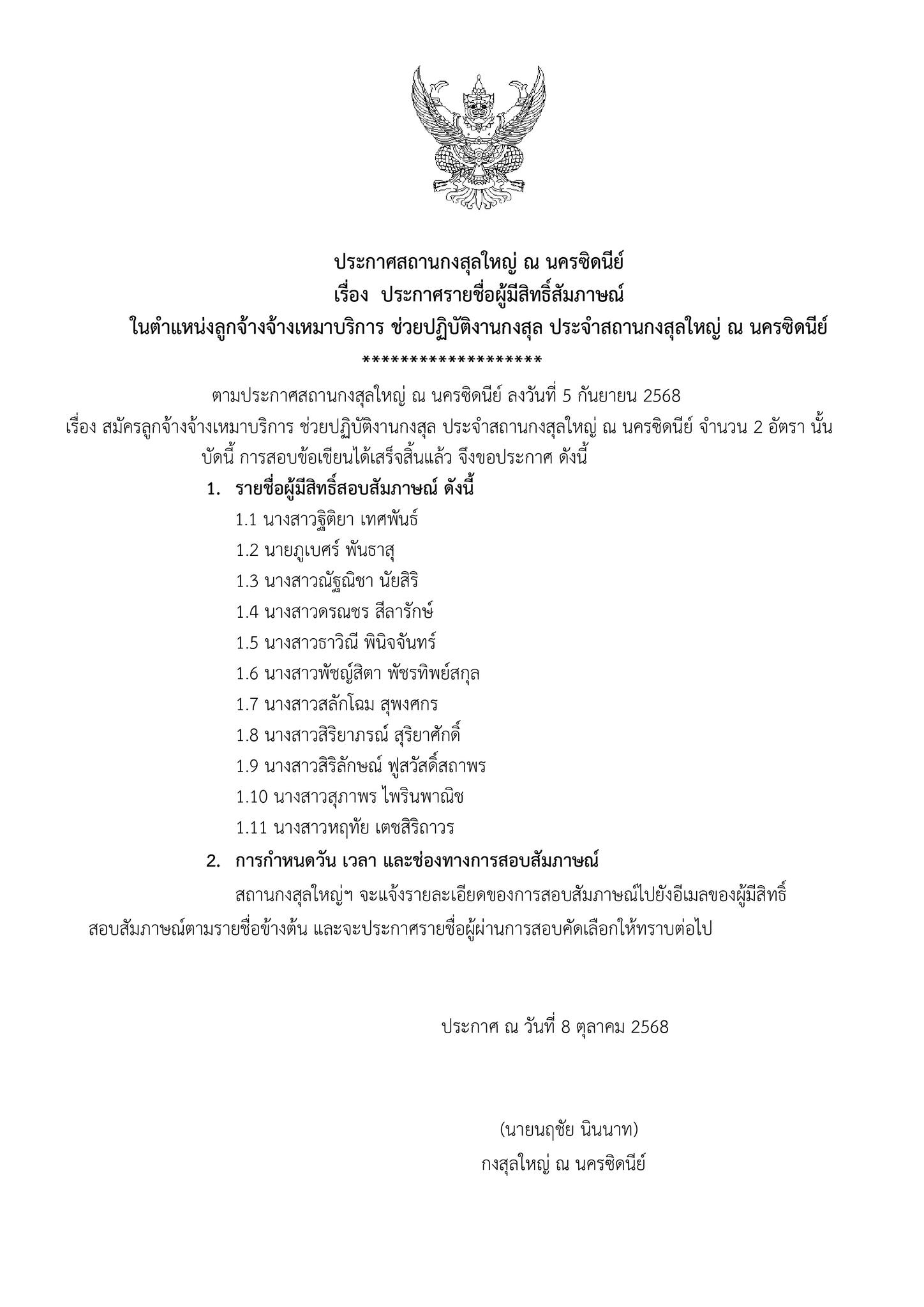 ประกาศรายชื่อผู้มีสิทธิ์สัมภาษณ์ ตำแหน่งลูกจ้างจ้างเหมาบริการ ช่วยปฏิบัติงานกงสุล ประจำสถานกงสุลใหญ่ ณ นครซิดนีย์
