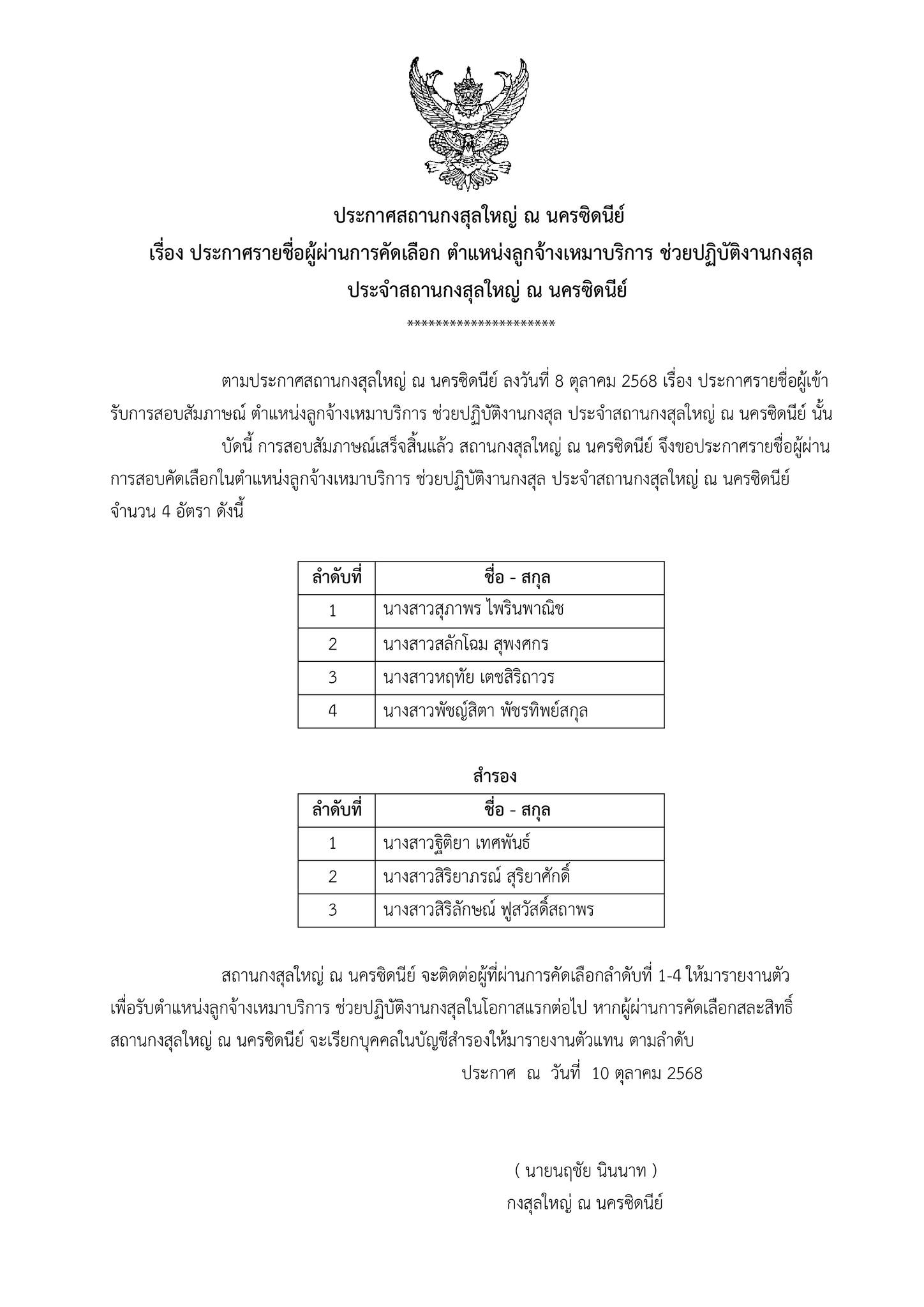 ประกาศรายชื่อผู้ผ่านการคัดเลือก ตำแหน่งลูกจ้างเหมาบริการ ช่วยปฏิบัติงานกงสุล ประจำสถานกงสุลใหญ่ ณ นครซิดนีย์