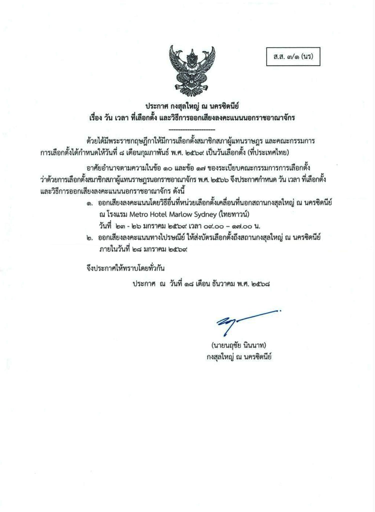 ประกาศเกี่ยวกับวิธีการจัดการเลือกตั้งนอกราชอาณาจักร สำหรับคนไทยที่พำนักอยู่ในรัฐนิวเซาท์เวลส์