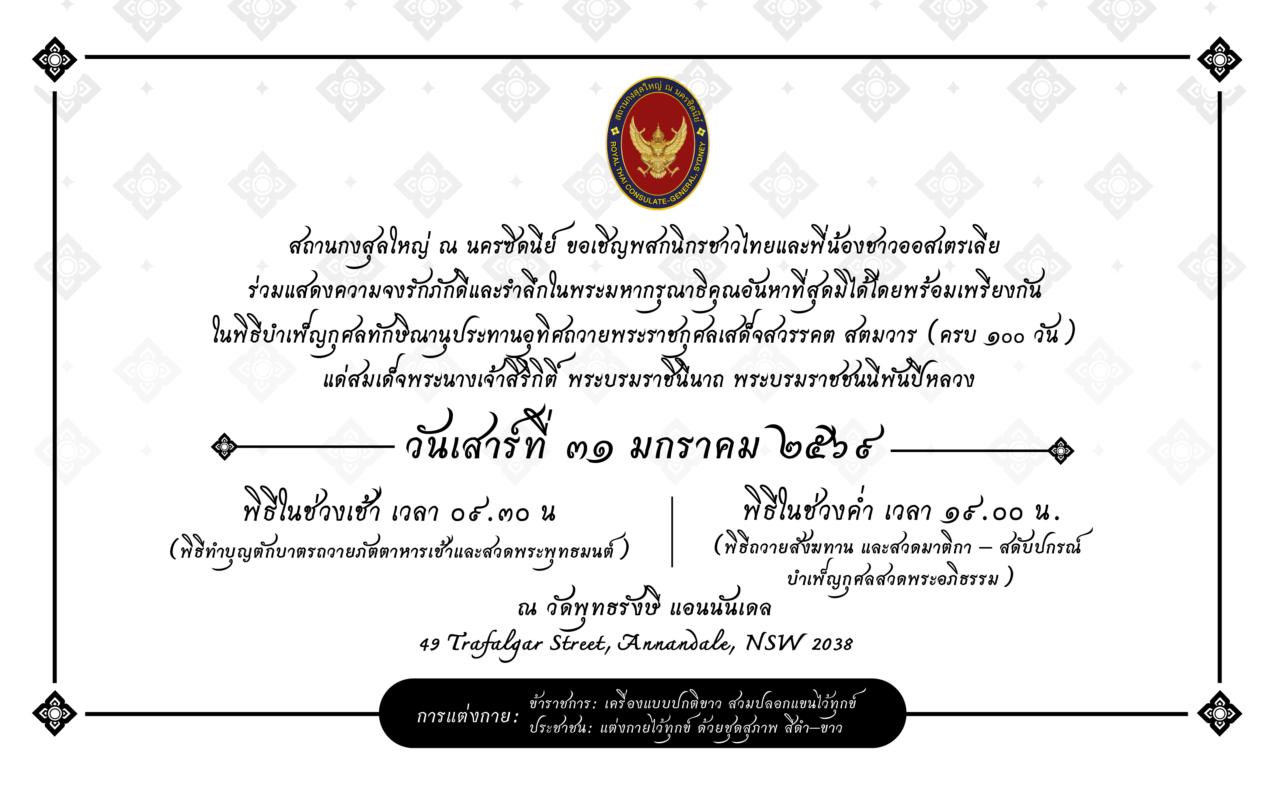 สถานกงสุลใหญ่ ณ นครซิดนีย์ ขอเชิญพสกนิกรชาวไทยและชาวออสเตรเลียร่วมแสดงความจงรักภักดีและรำลึกในพระมหากรุณาธิคุณอันหาที่สุดมิได้โดยพร้อมเพรียงกัน ในพิธีบำเพ็ญกุศลทักษิณานุประทานอุทิศถวาย พระราชกุศลเสด็จสวรรคต สตมวาร (ครบ ๑๐๐ วัน) แด่สมเด็จพระนางเจ้าสิริกิติ์ พระบรมราชินีนาถ พระบรมราชชนนีพันปีหลวง ในวันเสาร์ที่ ๓๑ มกราคม ๒๕๖๙ ณ วัดพุทธรังษี แอนนันเดล