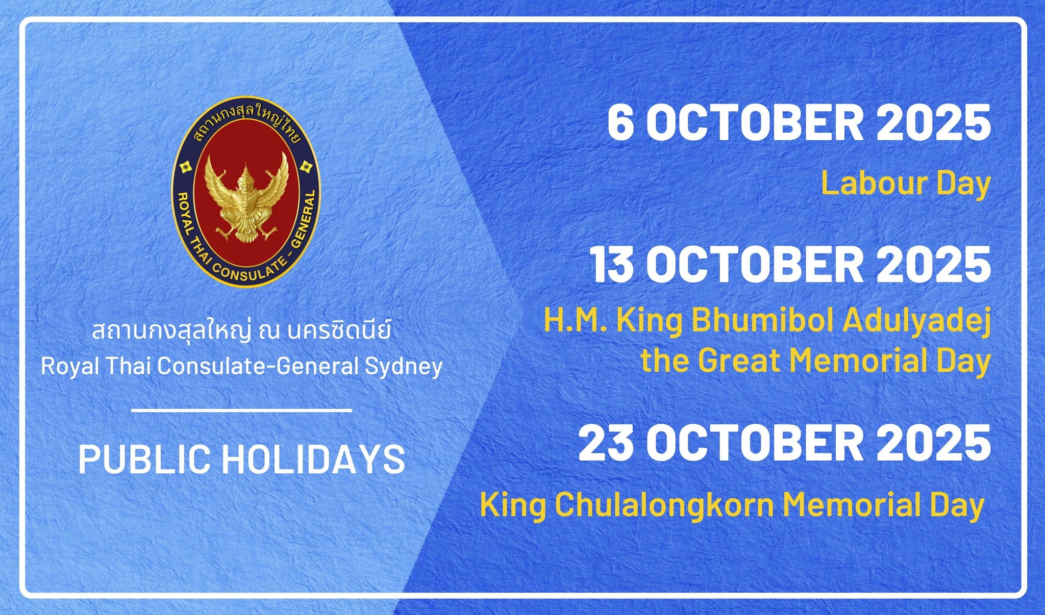ประกาศวันหยุดสถานกงสุลใหญ่ ณ นครซิดนีย์ เดือนตุลาคมค่ะ