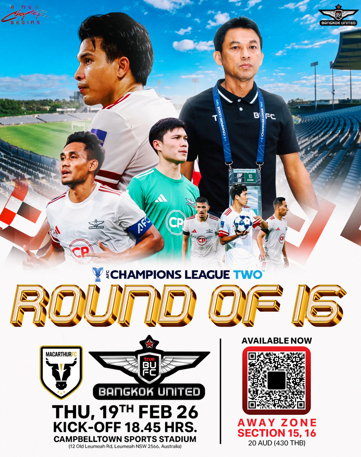สถานกงสุลใหญ่ ณ นครซิดนีย์ ขอเชิญชวนพี่น้องชาวไทยร่วมชมการแข่งขันฟุตบอลไทยในออสเตรเลียรายการ AFC Champions League Two รอบ 16 ทีมสุดท้าย โดยมีสโมสร True Bangkok United ซึ่งเป็นตัวแทนสโมสรฟุตบอลอาชีพจากประเทศไทยร่วมการแข่งขันในครั้งนี้