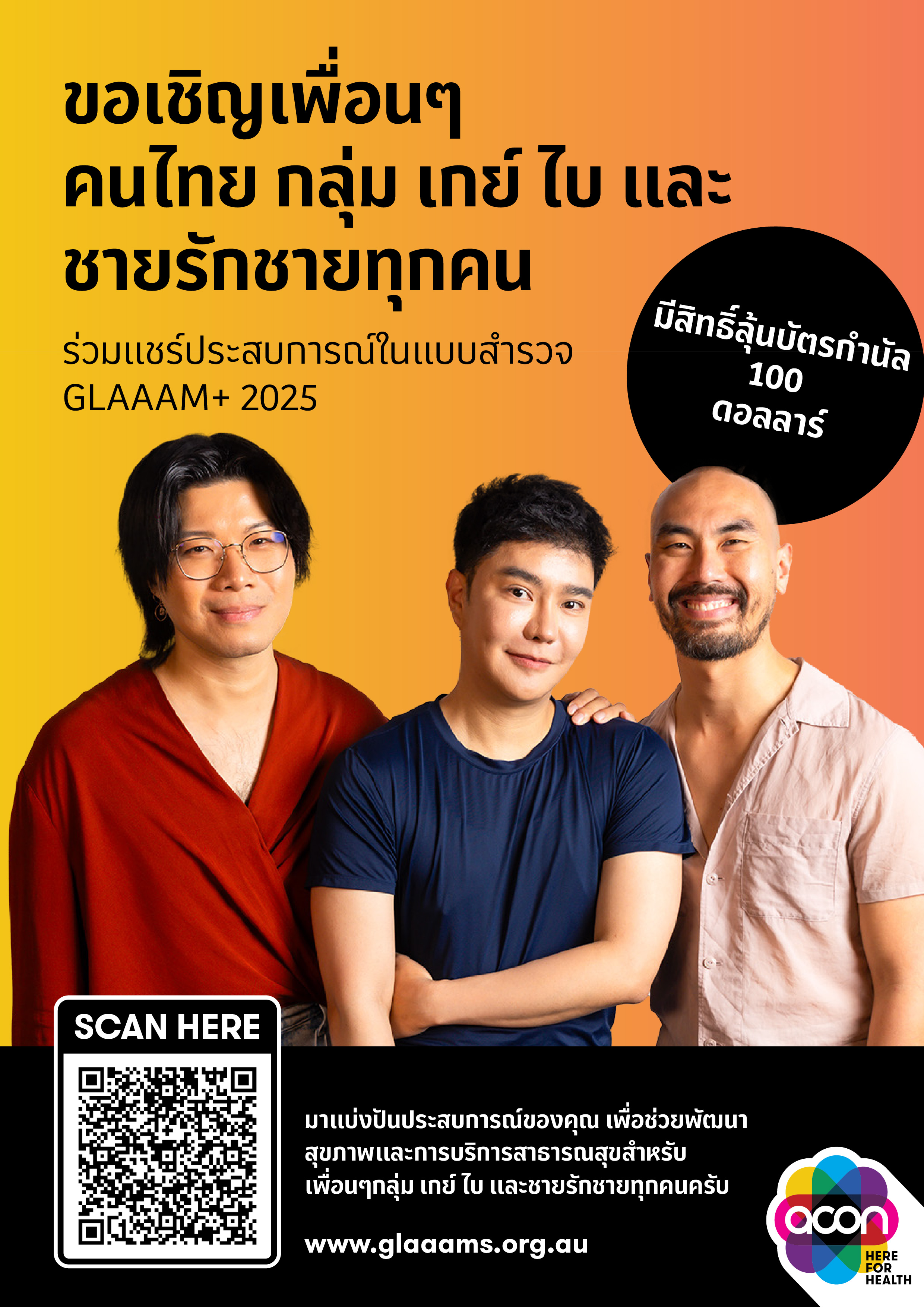 เชิญชวนทำแบบสำรวจสำหรับเพื่อนๆคนไทย กลุ่มชายรักชาย เกย์ ไบ+ หรือเควียร์ที่อาศัยอยู่ในออสเตรเลีย ทุกเสียงของคุณมีความหมายกับชุมชนของพวกเรา มาช่วยกันแบ่งปันเรื่องราวและประสบการณ์ของคุณ เพื่อร่วมกันพัฒนาบริการด้านเอชไอวีและสุขภาพทางเพศของทุกคน ให้ดียิ่งขึ้นสำหรับชุมชนของเรา พร้อมลุ้นรับบัตรกำนัลมูลค่า $100 จำนวน 10 รางวัล