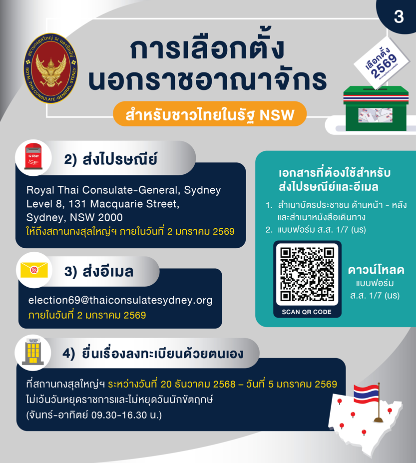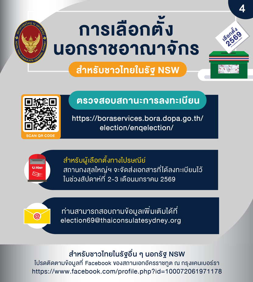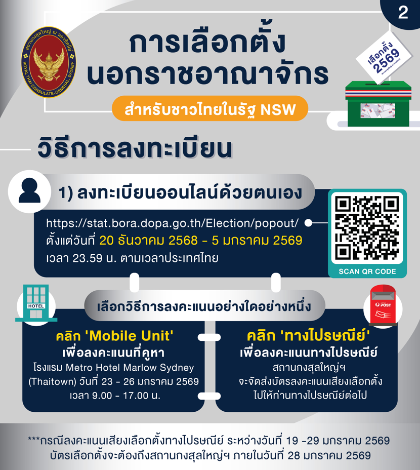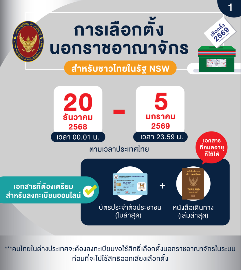 ตามที่สถานกงสุลใหญ่ ณ นครซิดนีย์ได้มีประกาศ ลงวันที่ 18 ธันวาคม 2568 เรื่องวัน เวลา ที่เลือกตั้ง และวิธีการออกเสียงลงคะแนนนอกราชอาณาจักร นั้น